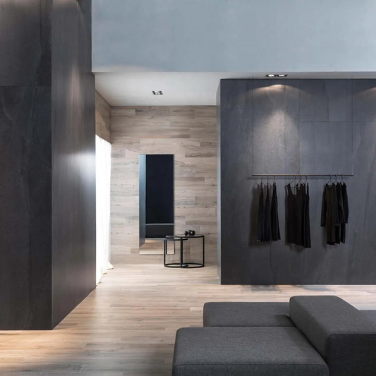Finition évoquant la pierre naturelle, avec des nuances proches de l'ardoise.